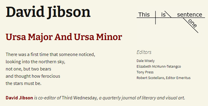 Ursa Major and Ursa Minor Published on September 29, 2020September 29, 2020 by Editorial Staff From Right Hand Pointing & One Sentence Poems and now included in Protective Coloration. Share this: Click to share on X (Opens in new window) X Click to share on Facebook (Opens in new window) Facebook Like Loading... Related