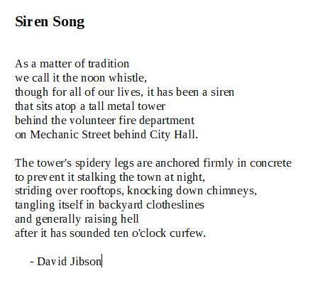Siren Song is a small town poem. Over the years I’ve taken inspiration from my early experiences and observations from the little town in which I grew up. This poem begins with one small town memory then takes off on a flight of childhood fantasy. This poem is from the collection, Protective Coloration, on sale from