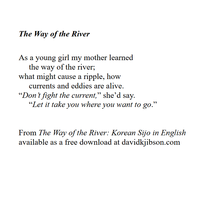 The Way of the River: Sijo Poetry in English is a chapbook that features many of my own Sijo poems and resource information on the Sijo form, including classical and contemporary examples. It’s a free download at: