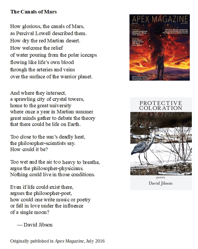 Astronomer Percival Lowell, founder of the Lowell Observatory, published Mars and Its Canals in 1906. His observations of the planet mars were greatly influenced by those of Giovanni Schiaparelli. The two men’s speculations generated many subsequent sci-fi novels, stories, movies and, eventually, this poem which appeared first in Apex Magazine and now in my collection, Protective Coloration, available from Kelsay Books and at Amazon.com.
