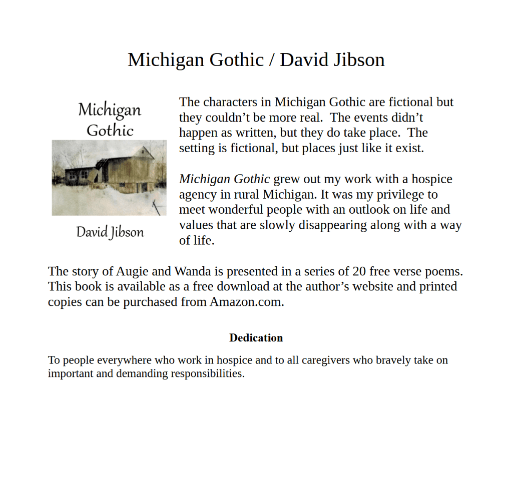 Augie and Wanda are two principal characters from my chapbook, Michigan Gothic. As death comes to Augie, it parallels the death of the American family farm and a culture that once helped to define who we are. This chapbook tells the story of Augie and his family through a series of twenty free-verse poems.  Available for $6.00 from Amazon.com. Better yet, read it for free at my website.
