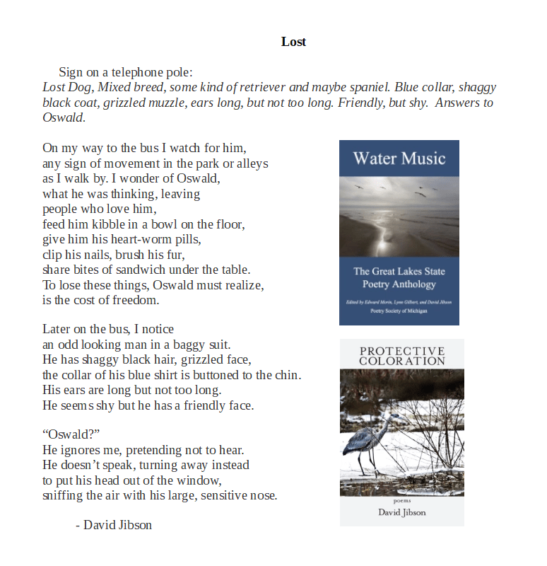 Lost first appeared in Alliteration, a magazine that has since disappeared. It was anthologised in Water Music. It’s now included in my collection, Protective Coloration, available at Amazon and at Kelsay Books.