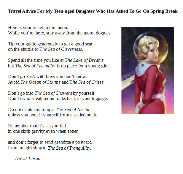This poem was featured at a fall meeting of the Poetry Society of Michigan. It was a response to a prompt from Elizabeth Kerlikowske, then president of the organization. “Write a poem giving someone advice. It could be an extended metaphor. And fun/clever/don’t even think of rhyming.”