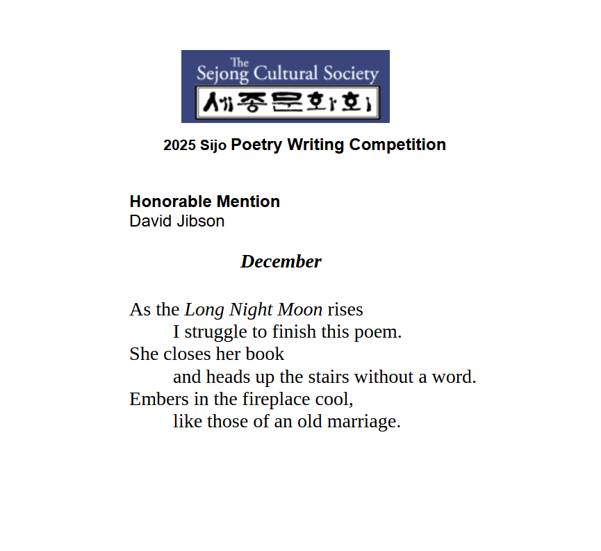 Pronounced Shi-jo, it is a concise Korean poetic form consisting of three lines, each containing 14-16 syllables, totaling 44-46 syllables. These lines feature a midpoint pause, akin to a caesura, although it need not adhere to a specific meter. The first half of each line encompasses six to nine syllables, while the second half should contain no fewer than five. Each line should consist of four groups of syllables that fall into natural groupings. 4/4/3/4 (total of 15 syllables) for example. Modern Sijo are often presented in six lines with breaks at the caesuras so the syllable groupings might 4/4 followed be a 4/3, or any combination of syllables as long as the total is 14-16.