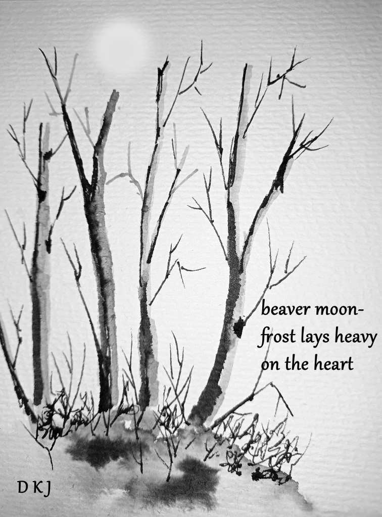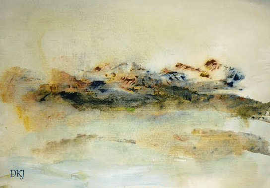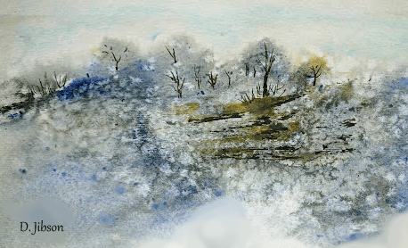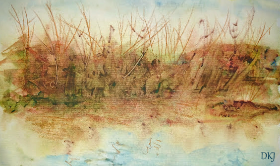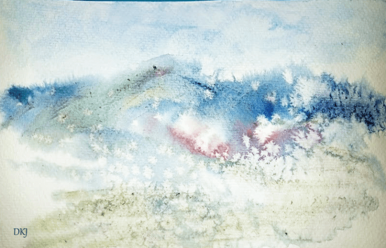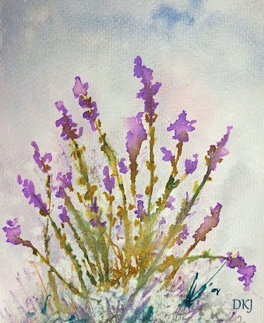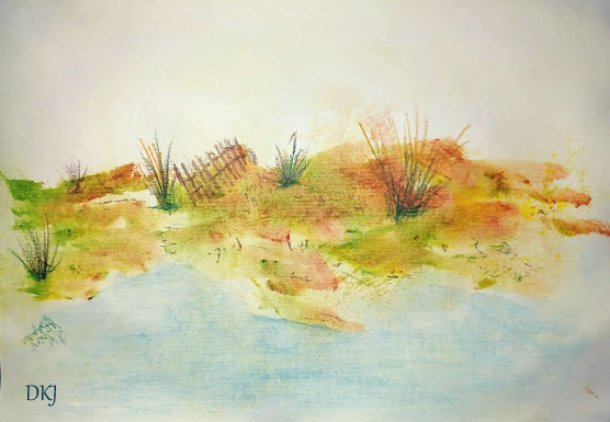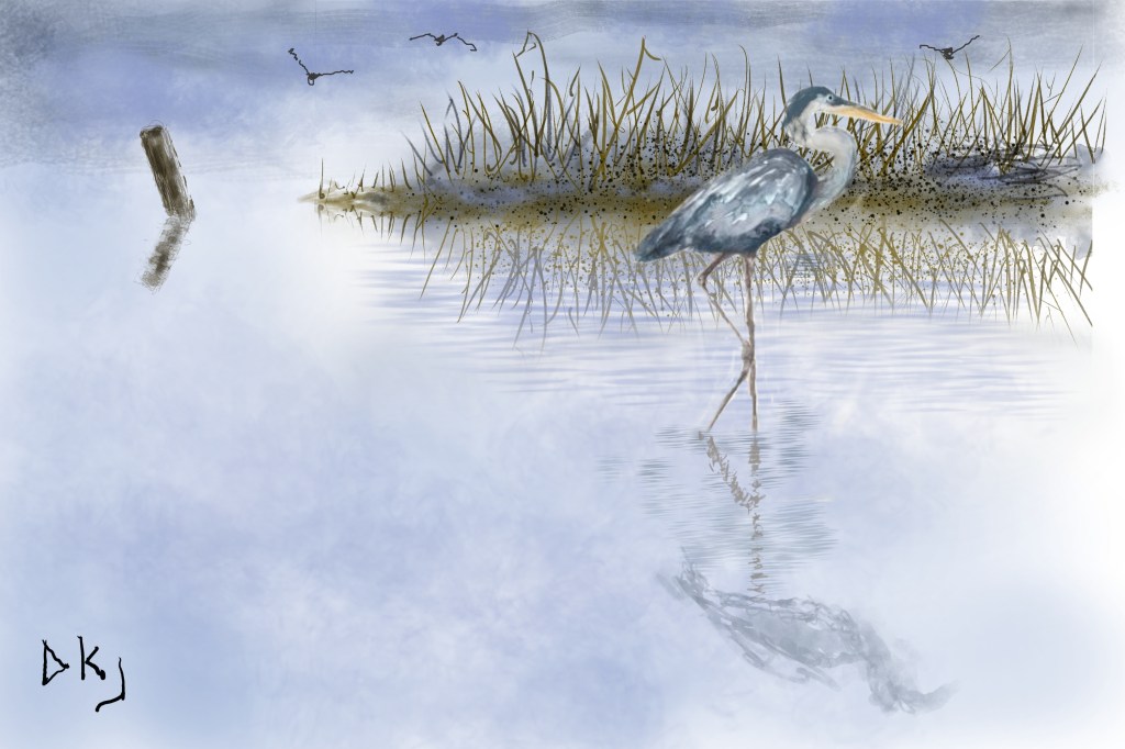 “On the Fence” – digitally enhanced watercolor. I began with an actual watercolor painting, photographed it, then used Krita to add the details, fence posts, birds, and vegetation. The advantage of hybrid art is that I can use the background image as many times as I want.
